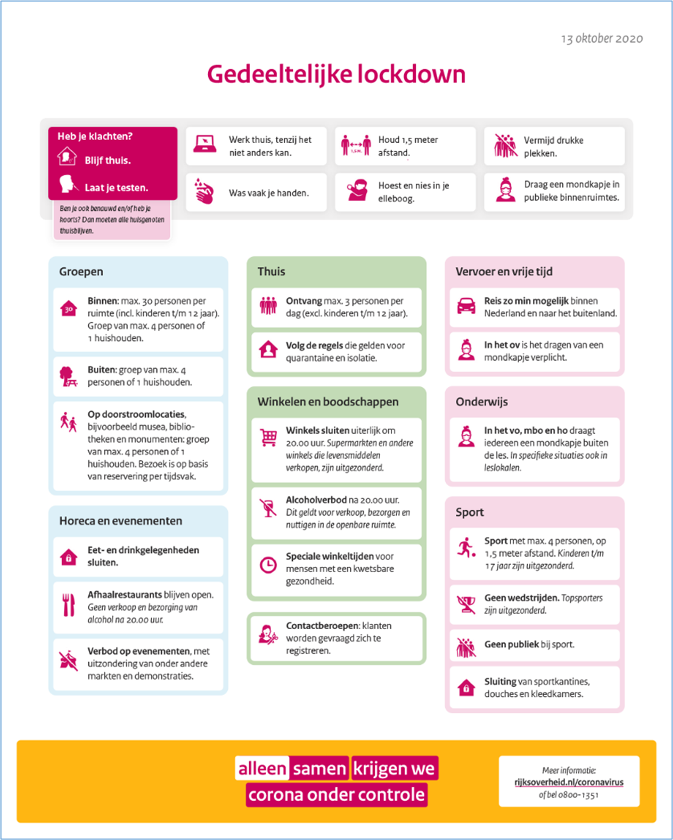 Kort samengevat: het aantal bewegingen binnen De Tien Gemeenten wordt drastisch verminderd en de bewoners en teams van de verschillende etages worden strikter van elkaar gescheiden. Hiermee voorkomen we dat er teveel onderlinge contacten zijn tussen bewoners en personeel van de verschillende groepen en etages. Afsluitend nog de mededeling dat er per bewoner maximaal twee bezoekers per dag op visite kunnen komen, graag op afspraak.
